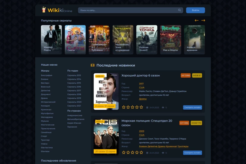 Красивый онлайн кинотеатр, с новым и адаптивным шаблоном, под все устройства. Установлены все необходимые модули ( без лицензий ), сайт работает на движке 14.2 версии DLE ( также без лицензии ).
